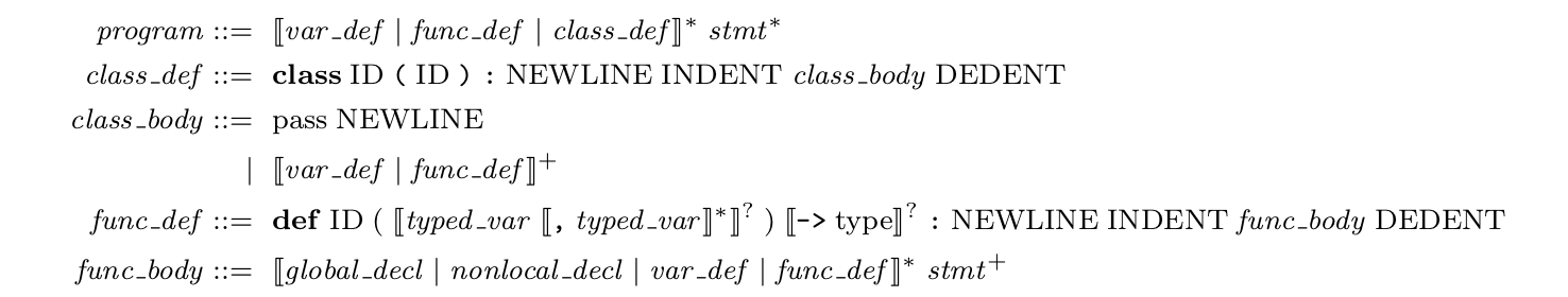 In this lab, focus on translating the grammar in Figure 3 of the ChocoPy Reference Manual to an idiomatic context-free syntax definition with constructors. In the next lab, you extend this definition with disambiguation rules for associativity, priority, and layout constraints.