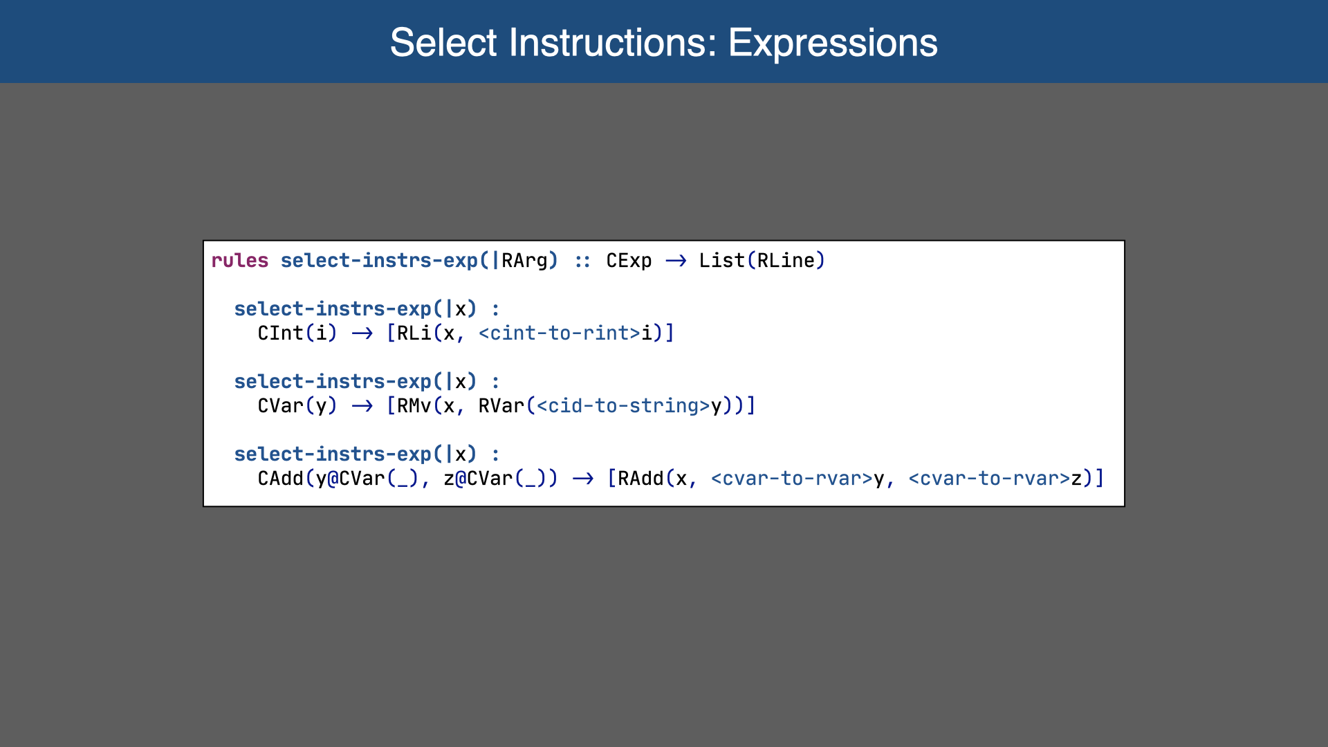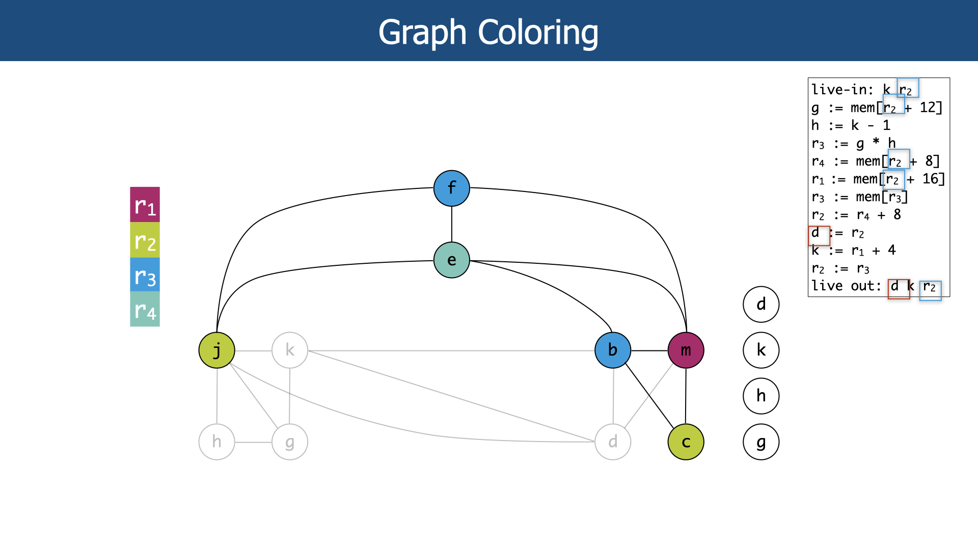 In the second part of the lecture we look at register allocation, i.e. mapping symbolic variables to concrete machine registers. An interference graph represents the (simultaneous) use of variables, which we obtain from liveness analysis. Using graph coloring we assign concrete registers to variables such that no two variables that are live at the same time are assigned to the same register. When that is not possible variables need to be spilled to memory.