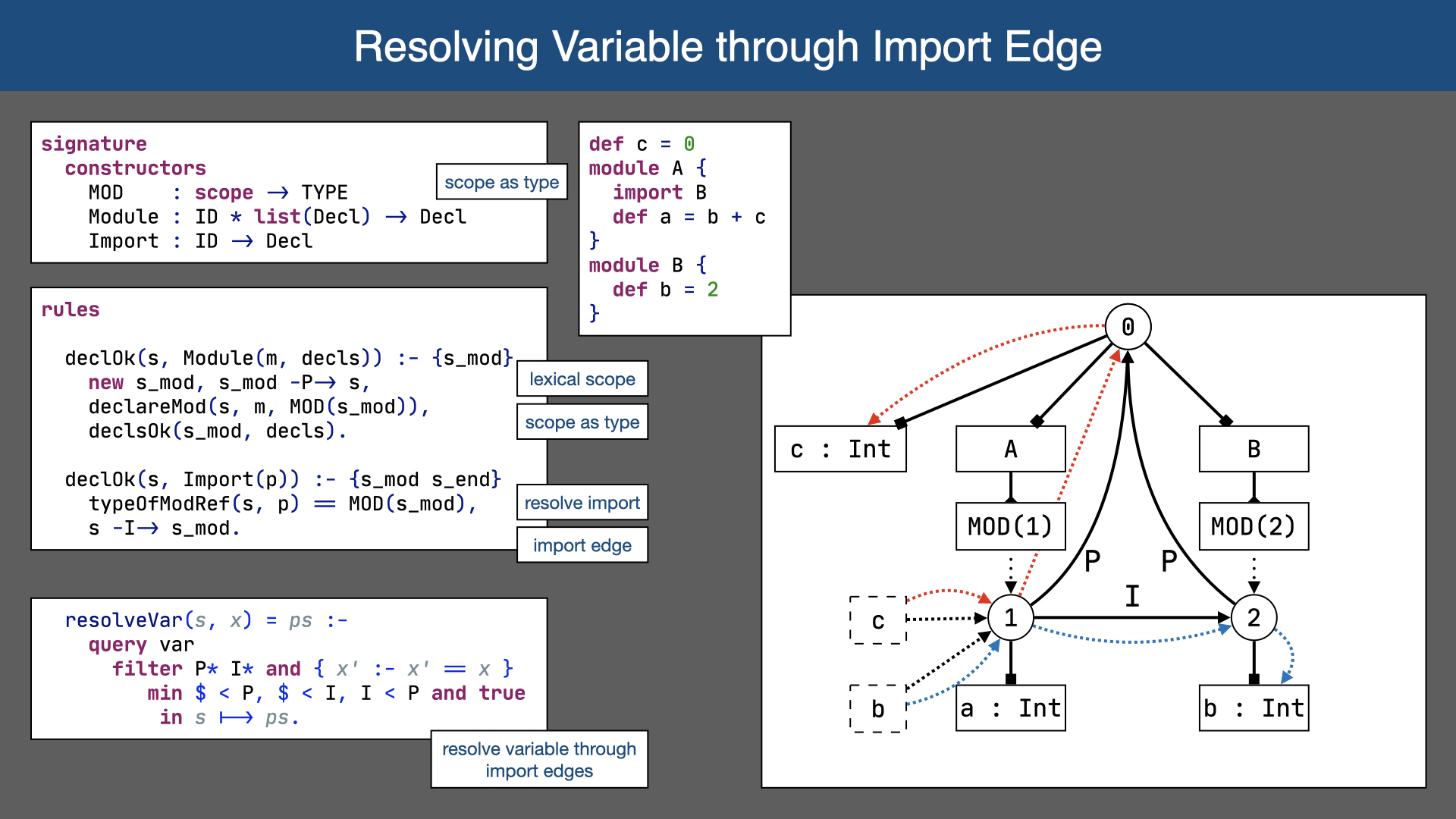 In addition to the lecture (see the recording on BrightSpace), see the talks about scope graphs below. The Curry On 2017 talk provides a somewhat higher-level presentation of the resolution calculus that is at the basis of resolution scope graphs. See also to Statix tutorial listed on the page of the previous lecture.